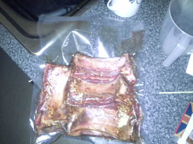 sello de vacío la carne usando el sellador (minas un pic de jml 4) pongo sal y pimienta en el pic de carne shin 2 y China sal y pimienta mezclan en el pic de costillas de Res 3 los tiempos y temperaturas casé del libro PIC 1 esto de amazon tiene su utilidad, pero más delgado que la id ha gustado sobre todo que lo en el internet para obtener más ideas. Cuando arriba a la temperatura en este caso 57,2 grados C pongo las bolsas en el baño de agua durante 48 horas para la carne de vaca de shin y 72 horas para las costillas. Por experiencia que sé que ambos serán tiernas como infierno cuando llevarlas a cabo, el shin se ser picado hasta (rosa todavía) y mezclaron con setas y una salsa rica y algunos hojaldre laminado listo para una empanada impresionante, las costillas la noche siguiente se le glaseadas con miel y blowtorched dar algunos char y disfrutar con nuevas ollas ejotes zanahorias y coles de mmmm