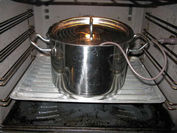 En pocas palabras; puesto vacío lleno de carne en una olla, cubrir con agua caliente, poner la olla en el horno con el termómetro de horno en el agua, ponga la tapa en, programar el horno y esperar 10 horas.