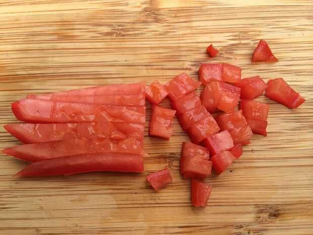 Girar horizontalmente el cuarto tomate en rodajas y cortar las tiras en un dado.