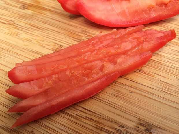 Tomar cada cuarto tomate y rebanar longitudinalmente en tiras por lo menos cinco.