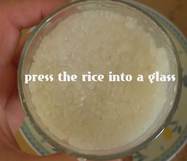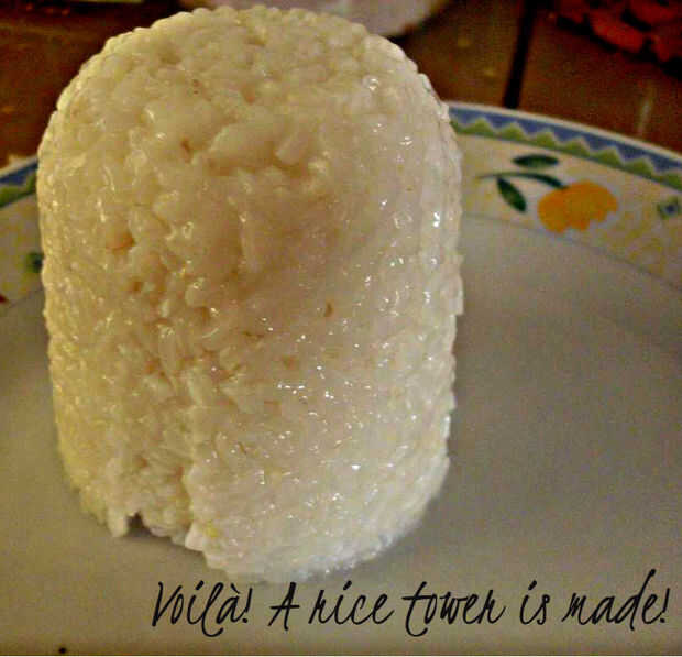 Cuando era poco mi abuela solía hacer un truco con el arroz que me ha encantado totalmente! Ella utiliza para moldear el arroz en un vidrio, prensado con una cuchara para que el aire hacia fuera y luego le dio vuelta boca abajo para permitir el deslizamiento de arroz fuera el vidrio sobre la placa. Si el arroz no se deslizará, ayúdate cuidadosamente con un cuchillo y dejar que el aire hacia fuera de los lados. Llamarlos '' torres de arroz ''.