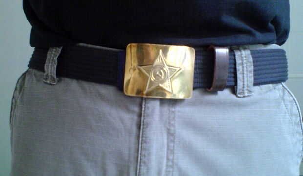 Decido sustituir inútil cinturón de Primark con correa del ejército soviético de lo eBay. Pero huelga de desastre! Correa uniforme del ejército es destinada con uniforme del ejército y es demasiado ancha para pantalones civiles regulares. Por lo tanto utilizo cierto ingenio comunista combinar el cinturón de tela con hebilla soviético.