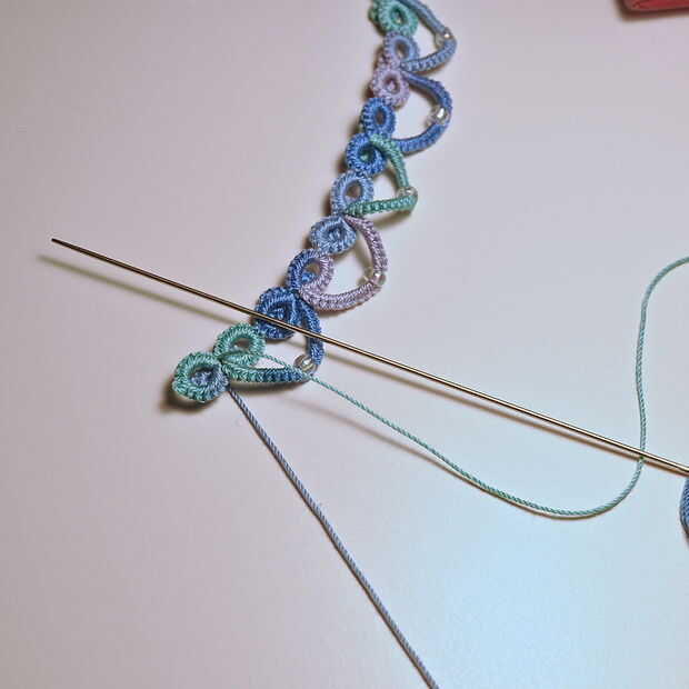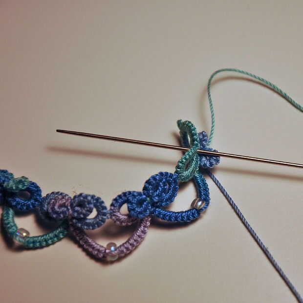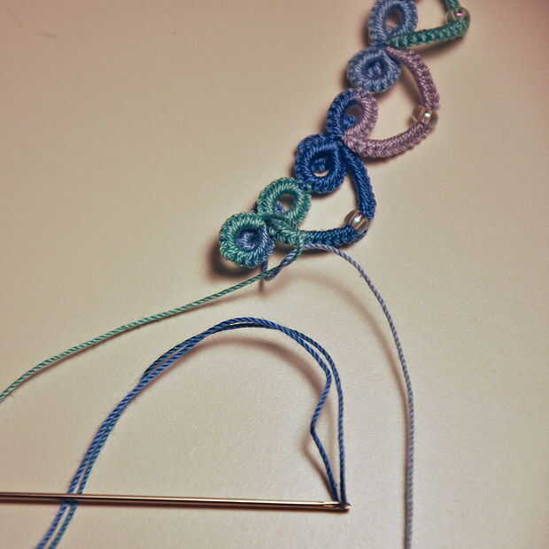 Tomar la aguja e ir detrás de los pequeños lazos y páselo por entre los grandes lazos. Debe haber un "agujero" entre Big-lazo-izquierda grande y Loop de derecha encuentro y (como se muestra en el cuadro 1).
