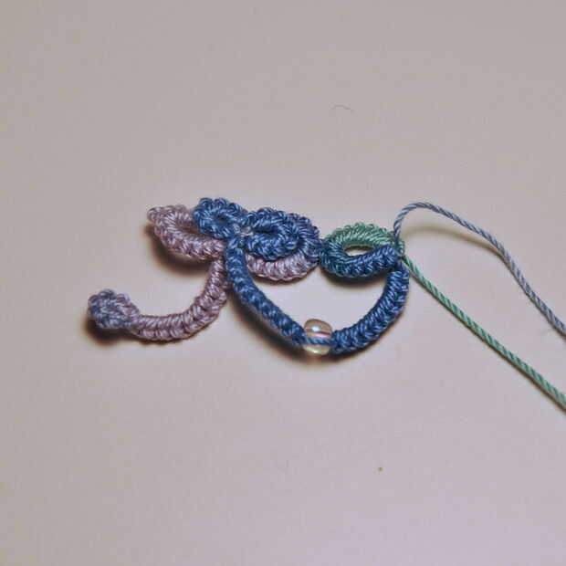 Partir de aquí, los arcos todos realizan lo mismo excepto los lazos grandes son: cerrar 8 puntos dobles, Únete a la izquierda gran lazo en el primer arco, 8 puntos dobles, entonces derecho-grande-lazo como antes, 8 puntos dobles, picot, 8 puntadas doble, cierre, nudo. Los lazos poco se hacen siempre el mismo.