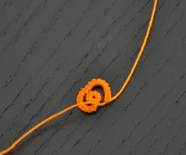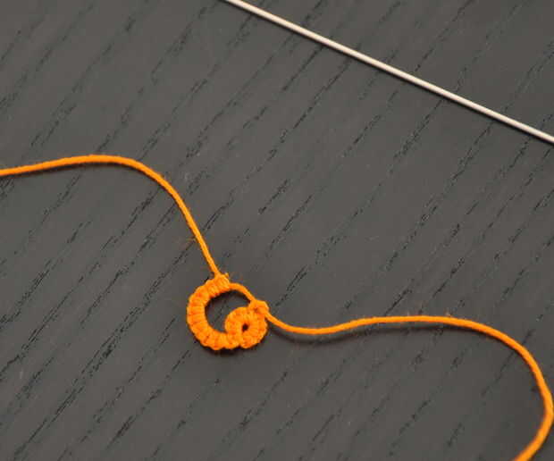 Tat diez puntos dobles, fije a la puntilla del primer anillo, continuar con diez puntos más dobles, introduzca la aguja en donde empezaste el primero diez puntos dobles, cerrarla y nudo.