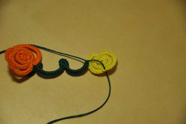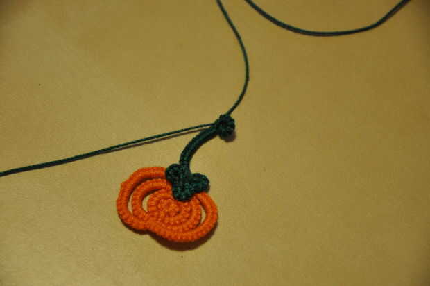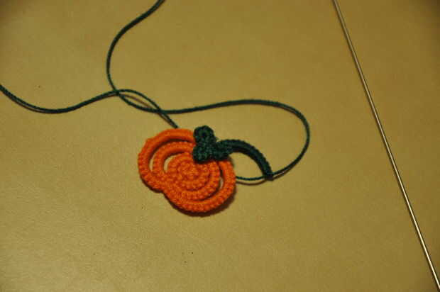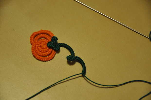 Al final, después de conectar y añadir hojas a la calabaza pasada, es una enredadera de 10 puntadas doble, cierre, nudo, anillo de 6 puntos dobles, cierre, nudo.