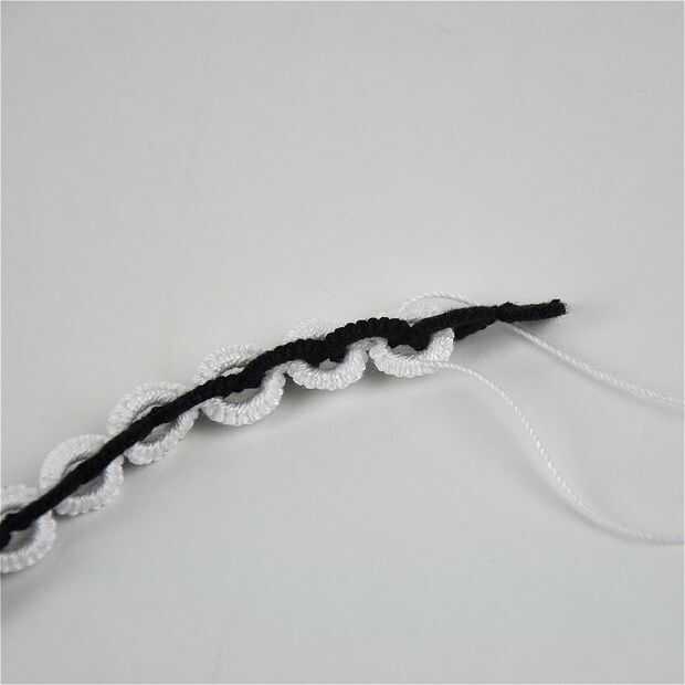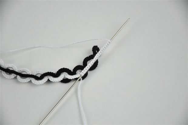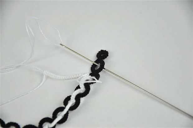 2. Tomar la aguja y tejer a través del anillo pasado 10/10 y luego la armadura a través de la segunda al último anillo.  Ya que usted es encaje te puede cortar el hilo de la bola, pero deje suficiente para atar el anillo y esconder los extremos. (Imagen 3)