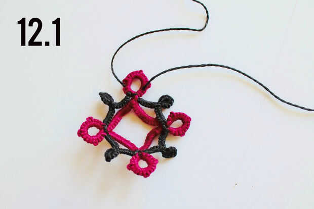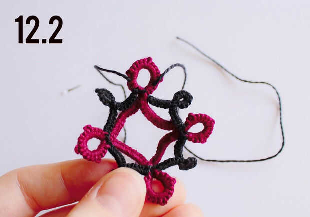 1-2. para terminar la capa externa, pasar la aguja a través de una puntada doble del anillo y ata con dos nudos de rizo. Meter ambos extremos a través de dos o tres dobles de la puntada del anillo. Trim.