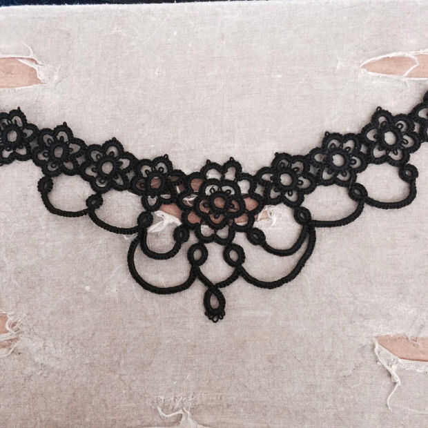 Con mi tensión y la longitud total del collar debe ser alrededor de 14 pulgadas de rosca de tamaño 10, cada pequeño motivo es aproximadamente de 1 pulgada, para que pueda ajustar la longitud sumando o restando margaritas.