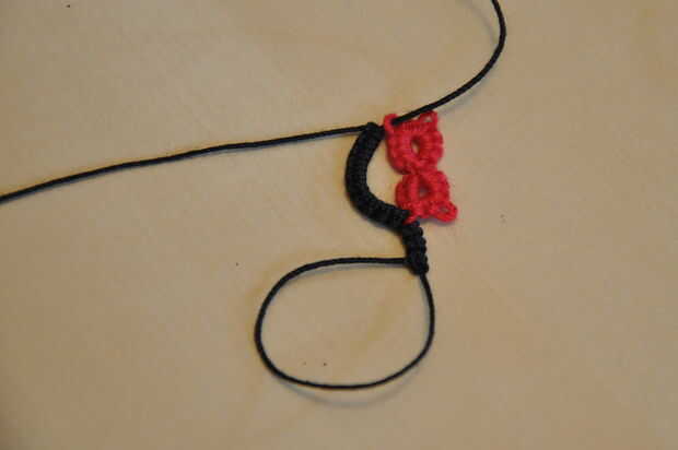 10 TAT doble puntos de sutura y conectar a la parte superior izquierda de la puntilla. Tienes que tirar de la aguja a través de hacer esto. Asegúrese de no tensar el hilo. Como se puede ver en la segunda foto, deje el lazo del anillo abierto para puedan cerrar su anillo después de encaje y conectar el cuerpo.