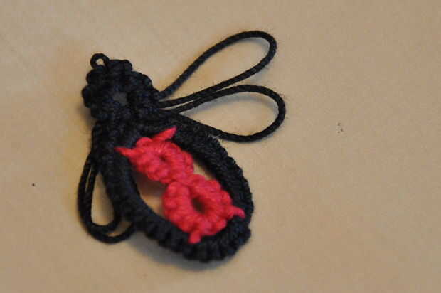 Para empezar la cabeza tat 1, hacer una gran puntilla, tat 1, picot grande, (este se pone un poco difícil de trabajar, sólo trate de mantener los picots bajo control, también tratar de hacer todos los picots grandes del mismo tamaño.) tat 2 puntadas de doble regulares, reversa picot (tat 2 de la primera mitad de la puntada doble, hilo de retención para la puntilla y 2 de la segunda mitad de la puntada doble de tat) tat 1, la puntilla, tat 1, inversa picot (igual que la primera), tat 2, gran puntilla, tat 1, picot grande, tat 1, cierre, doble nudo, ocultar extremos.