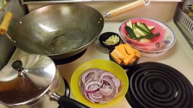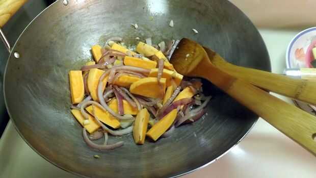 - Añadir las rebanadas de patata dulce y saltéalos hasta que estén tiernos (unos 6 a 8 minutos (o hasta que comiencen a marrón)