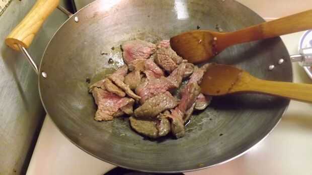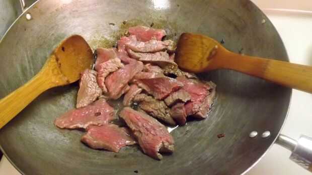 - Limpie el Wok o la sartén con papel absorbente, luego agregar las 2 cucharadas restantes de aceite. Agitar la sartén para abrigo y calor hasta que el aceite comience a fumar; luego agregar las rodajas de carne de res y saltéalos hasta que ya no es rojo (hasta que la forma que gusta; Me gusta mantener mi medio de carne de vaca rara). Retire la carne y ponga a un lado (que tenga para freír en 2 lotes, dependiendo del tamaño de su sartén y la cantidad de carne de res que han preparado)