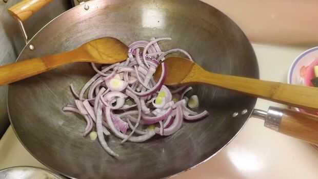 - Agregar la cebolla en el aceite caliente y saltéalos hasta que se ablanden (hasta que estén transparentes)