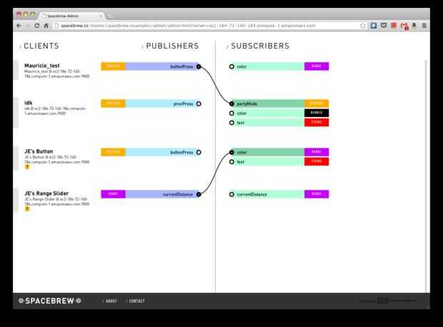 Esencialmente, cada vez que se ejecuta un ejemplo Spacebrew (proceso, javascript, etc.), un "Editor" o "suscriptor" se crea en el servidor de Spacebrew. La documentación oficial tiene ejemplos de cómo ejecutar nuestro propio servidor, pero también hay un servidor público disponible para uso inmediato.