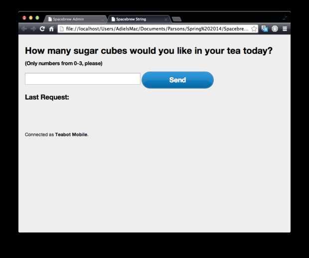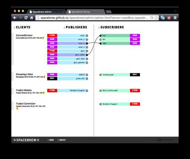 Una vez que se ejecuta la aplicación de procesamiento de bosquejo y javascript se puede ver se muestran en el servidor público spacebrew. Una vez que la ves, sólo haga clic en la parte editorial de la "teabot movil" (el nombre dado a la aplicación de javascript) y conéctelo a la parte de abonado del controlador de"teabot" (el nombre dado al proceso de dibujo).