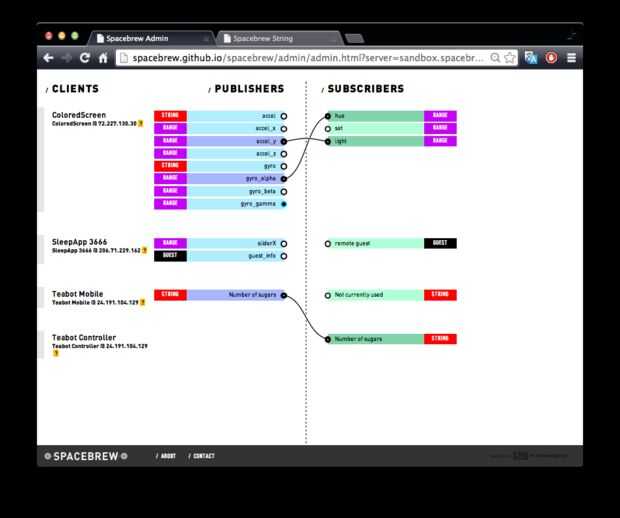Nota: El servidor de "sandbox" de spacebrew es un servidor público mantenido generosamente abierto a cualquier persona que quiera experimentar con spacebrew. Esto significa que usted verá otros proyectos está trabajando al mismo tiempo como usted. Practicar la regla de oro y sólo jugar con conexiones entre sus propias aplicaciones.