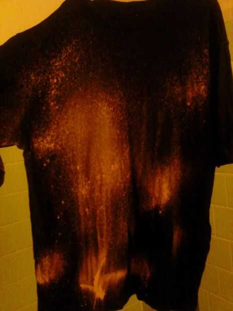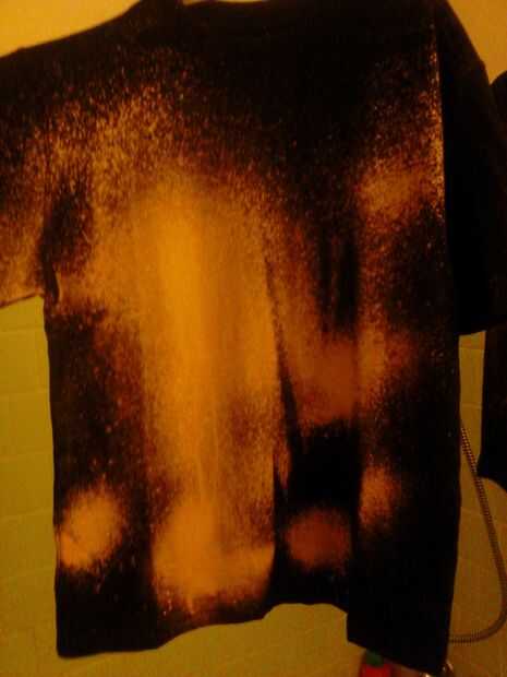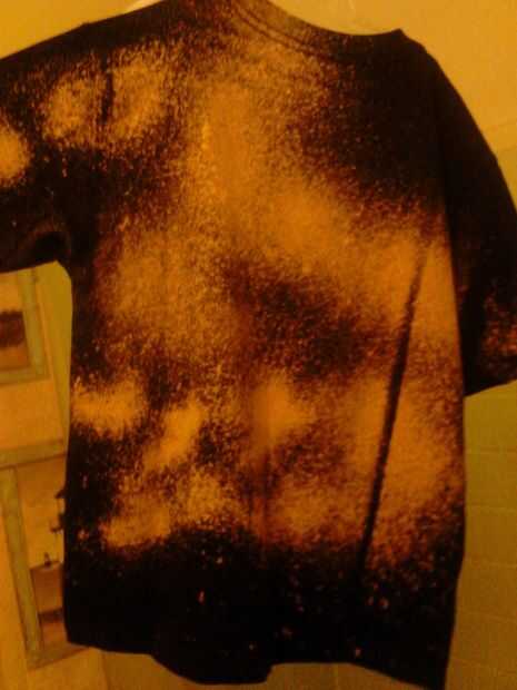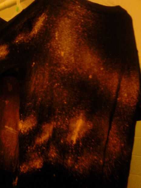 Colgar o poner la camisa en un área de pozo ventillated y rocíela con lavandina. Spray tan poco o tanto como usted desea. Tarda un minuto o dos para sus efectos sean visibles. Por todas partes que el blanqueador toca cambiará de color como la mayoría de nosotros que tiene la desafortunada tarea de lavandería sabemos bien. El sobre todo el efecto está muy bien. Usted puede agregar algunos colores fríos para realmente sacar la mirada de la galaxia. Trate de doblar o atar secciones con bandas de goma como en tie dye y ver qué pasa.