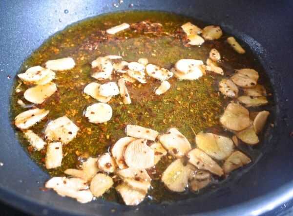 Se trata de una clásica combinación de 3 ingredientes básicos aceite de oliva, ajo y hojuelas de pimiento rojo. Usando calor bajo para continuar con la cocción, el resultado final es una salsa de aceite de ajo muy hermoso, sabroso y reconfortante. Retirar del sartén y añadir a la pasta drenada inmediatamente.