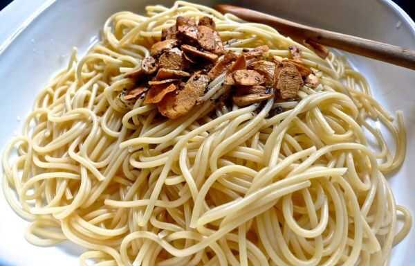 Combinar la pasta escurrida con la salsa de aceite de oliva ajo infundido y lanzamiento hasta que los espaguetis estén bien cubiertos. Agregar un cucharón del agua de la pasta reservada si es necesario. Es mejor tirar la pasta en una olla caliente con la salsa de aceite de ajo caliente.