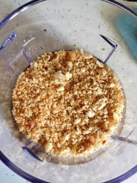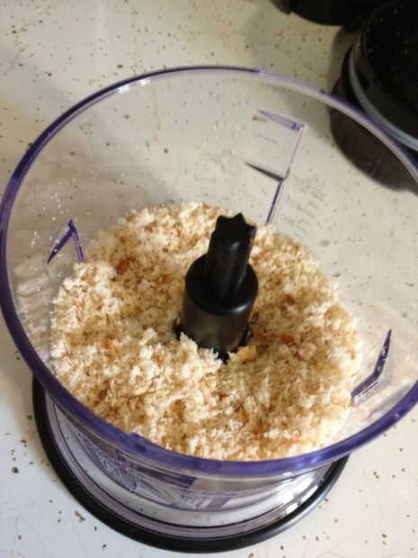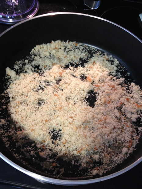 Pan de pulso en procesador de alimentos hasta trozos de tierra. Calentar 1 cucharada de aceite en una sartén antiadherente de 12 pulgadas a fuego medio. Cocinero de migas de pan hasta que estén doradas, unos 5 minutos. Añadir la mitad de ajo y 1/8 cucharadita de copos de pimiento y cocine hasta que el fragante, unos 30 segundos; transferencia a los bolos. Limpie el sartén con papel de cocina.