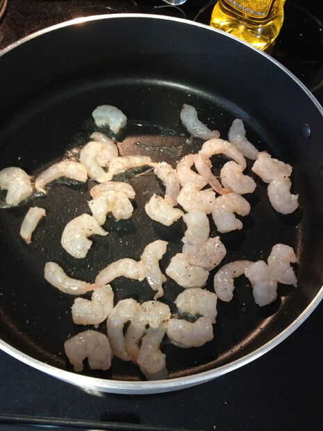Corte los camarones en el medio, camarón pat secan con toallas de papel y sazone con sal y pimienta. Calor 1 cucharada de aceite en una sartén sobre fuego medio alto hasta a fumar ahora vacía. Añadir la mitad de los camarones y cocine sin mover hasta que se doren manchada en primer lado, aproximadamente 1 minuto; transferencia a los bolos. Repita con el restante 1 cucharada de aceite y restante camarón.