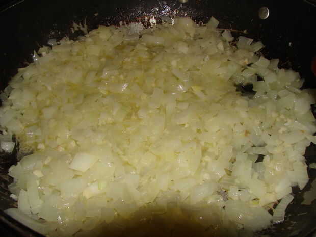 Vierta el aceite de oliva y la mantequilla en su pan. Añadir la cebolla y el ajo y sofría hasta que la cebolla se ve un poco translúcida.
