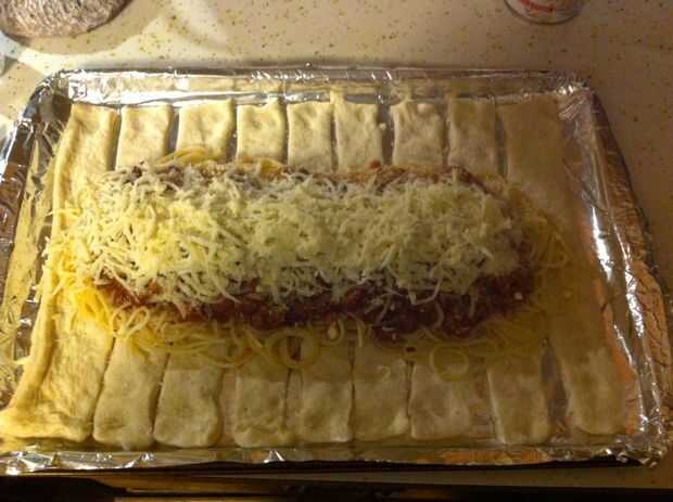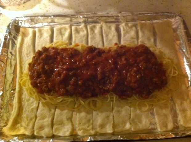 espaguetis, albóndigas, pan de ajo. Nunca más necesitará separados bocados para disfrutar de todos los componentes de un plato clásico. Como un Pi inspiró a bono, contiene círculos (el pastel), esferas (las albóndigas) y cilindros (los espaguetis), t