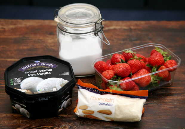 -Para la "salsa de tomate": fresas y azúcar, o salsa de fresas pre-preparada. Yo usé 150g (una taza colmada) de fresas y 1.5 tazas de azúcar (bastante para 4 porciones).