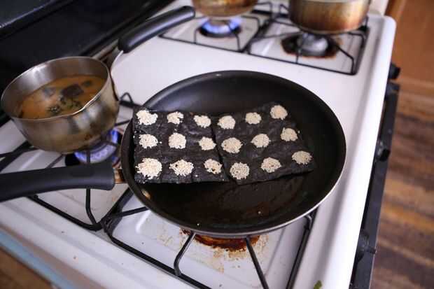 Un tratamiento especial de la mamá de mi amigo se llama Gimbugak (triple capas de algas pegadas con sésamo y jugo de arroz pegajoso). Calentar en una sartén con una pizca de aceite, sólo hasta que se convierte en cripsy. Delicioso Kimchi es de mi mamá que aire lo envía como un regalo. El arroz es arroz simplemente blanco. Sopa de miso es por David, tenía grandes shiitake setas y calabaza.
