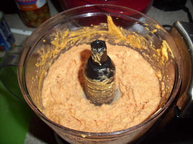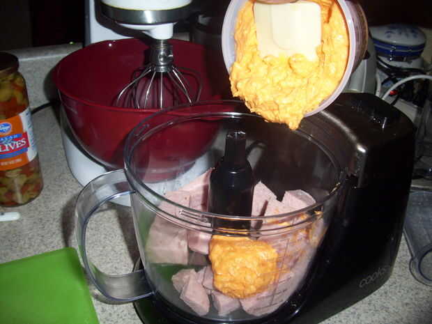 Primero quiere cortar el spam en mandriles (Chucks) para que se mezcla en más fácil en el procesador de alimentos. Luego raspar en el queso de pimiento (con su espátula dandy práctica). Ejecutar el procesador, raspando los lados para asegurarse de que todo se mezcla bien.