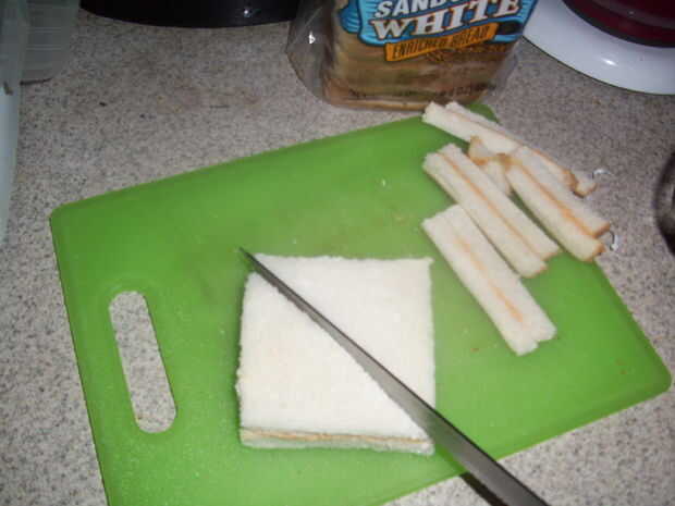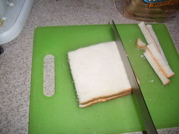 Ahora sacar un cuchillo de pan bueno, fuerte y cortar las cortezas. Guárdelos para merendar más adelante. Luego cortar el pan de esquina a esquina en diagonal, para formar 4 triángulos pequeños. No olvide limpiar el cuchillo de vez en cuando entre los cortes, de lo contrario el pan no cortado así y los sándwiches tendrán bordes irregulares.