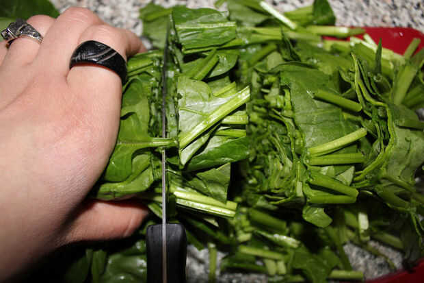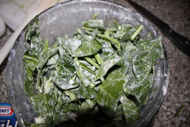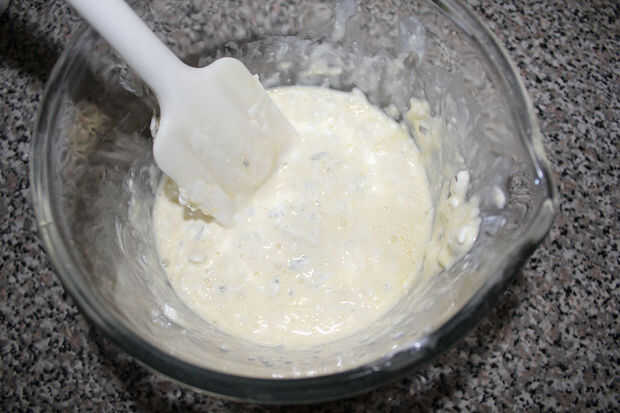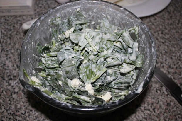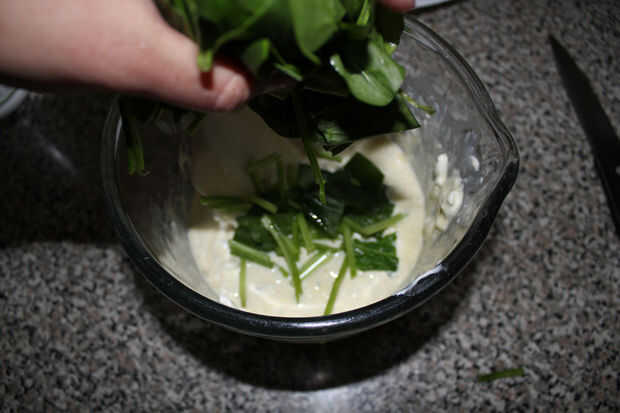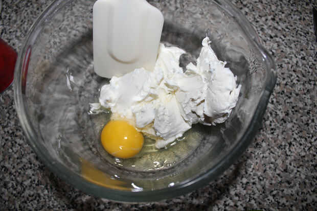 Asegúrese de que el queso crema es suave antes de vencer en un huevo entero. Mezcle la espinaca en y mezclar bien.