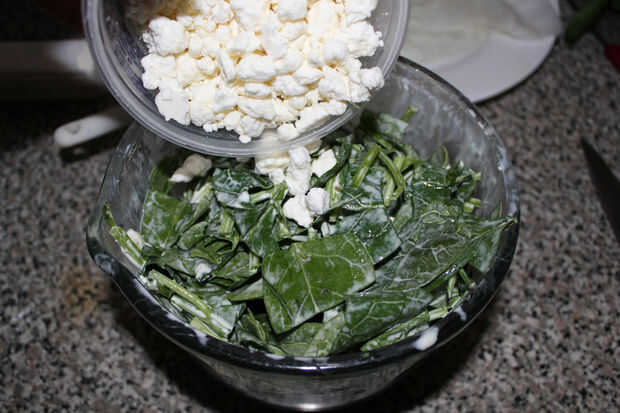 Ahora agregue el queso feta. Queso feta es muy salado, así que consciente de si usted planea agregar cualquier especias extras por cualquier motivo (Ridicule).