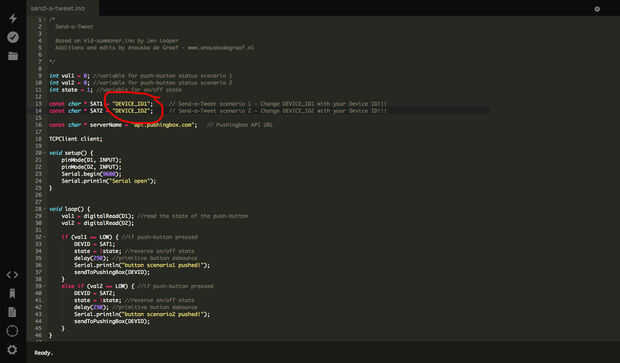 Como se indicó en el paso anterior, cada escenario tiene su propio DeviceID. Cuando usted mira el código, verá DEVICE_ID1 en la línea 13 y DEVICE_ID2 en la línea 14 (ver imagen). Necesita cambiar al DeviceID de sus escenarios.