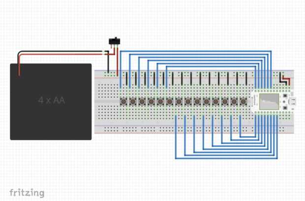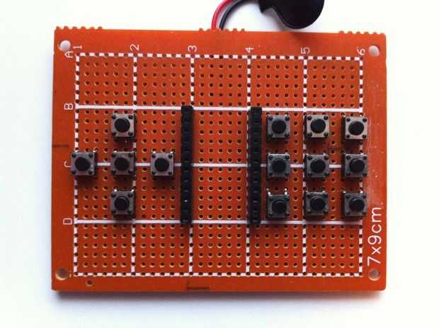 Una vez que has encontrado todo lo que necesitas, procedió mediante el establecimiento de los diferentes componentes en la placa de prototipos. Con un poco de suerte, todo debe encajar y puede ir a soldar todos los botones y hacer las conexiones: una vez cada lado va a la tierra, al otro lado a uno de i/os.