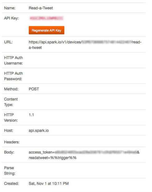 A continuación tenemos que rellenar la URL. Para este campo vas a necesitar el ID de dispositivo de su base. La URL será el siguiente: https://api.spark.io/v1/devices/DEVICE_ID/read-a-tweet