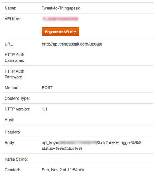 Luego de vuelta a nuestro ThingHTTP! El cuerpo será como sigue: api_key =WRITE_API_KEY& Campo1 = %% gatillo %% & estado = %% estado %%