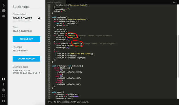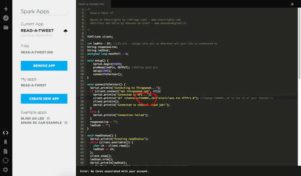 Pasa a https://www.spark.io/build e inicie sesión con su cuenta. En el azul, haga clic en el botón de crear nueva aplicación . Dar a tu aplicación un nombre en el menú de la izquierda. Copie el código adjunto a este Instructable chispa construir.