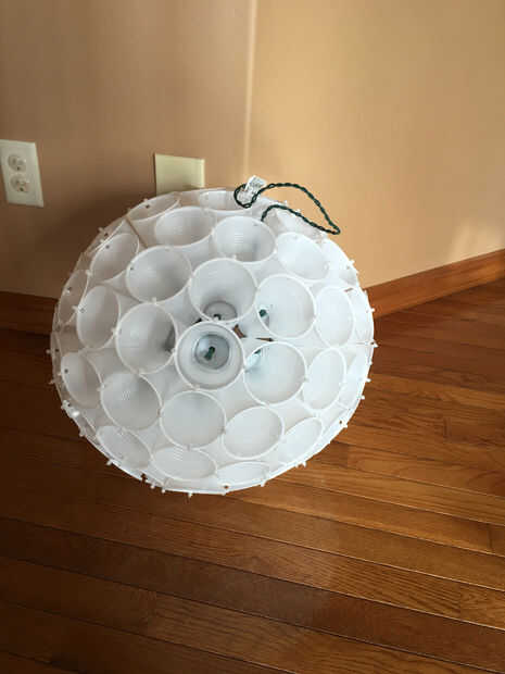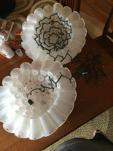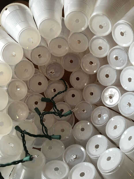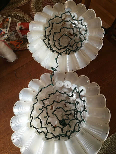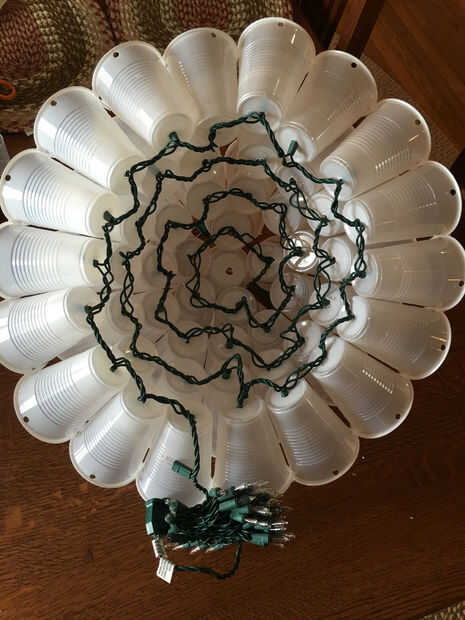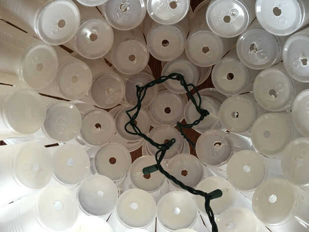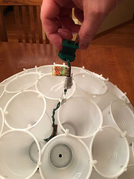 Para empezar el cableado no pongas una luz en la Copa del centro puesto que sólo tenemos 100 luces. Comience con la copa junto a la Copa del centro y colocar las luces en las tazas en un patrón circular a partir del centro y su forma de trabajo hacia fuera. Esto se asegurará de que usted terminar en el borde exterior del círculo para que pueda empezar el cableado de la otra mitad.