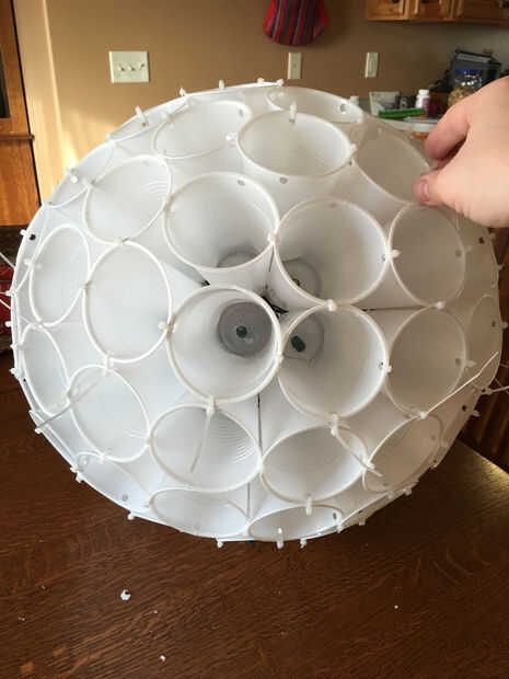 Una vez que ambas mitades hechos, colocarlos uno encima del otro para completar la bola. Entonces usted necesita ir y coloque las tazas que alineen los agujeros y agujeros nuevos en los que no. Clip de las longitudes de lazo extra zip off y termine!!!