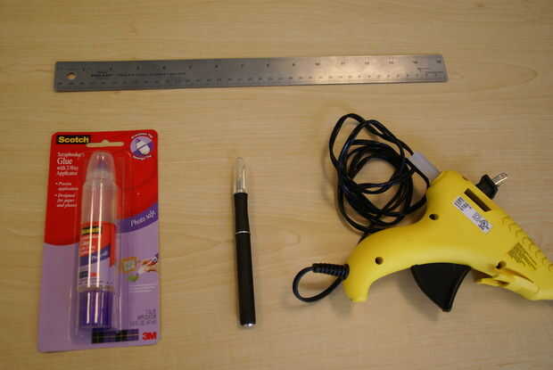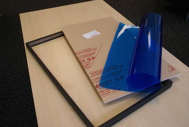 Los materiales que necesitamos son un marco, la hoja de acrílico y una película de vinilo transparente de color azul. Las herramientas que utilizamos son una herramienta mellar, una botella de pegamento líquido, una pistola de pegamento caliente y una regla.