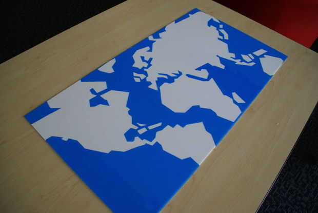 Imprimir el mapa del mundo y cortar la película de vinilo según el mapa. En este diseño, nos recorta los continentes y dejar los océanos en el mapa. Después de que nos pegue la etiqueta en la hoja de acrílico.