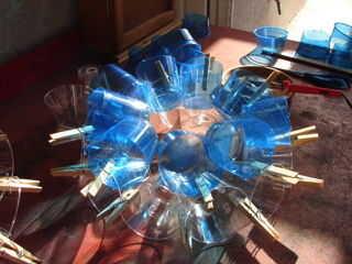 Con los pernos de la ropa, espacio 9 tazas en la parte superior y alrededor del anillo de 12 tazas. (La foto muestra la segunda capa en tazas azul al ser más fáciles de seguir). Esparza, tazas con orificios igualmente alrededor del anillo. Las nueve copas, en sus bases, cada uno al otro y a la primera capa de la soldadura. Usted debe ver la formación de bola media, como una cúpula.