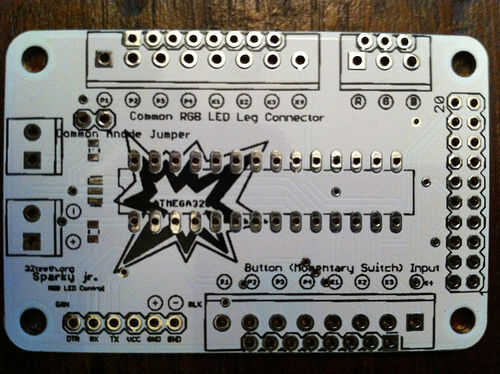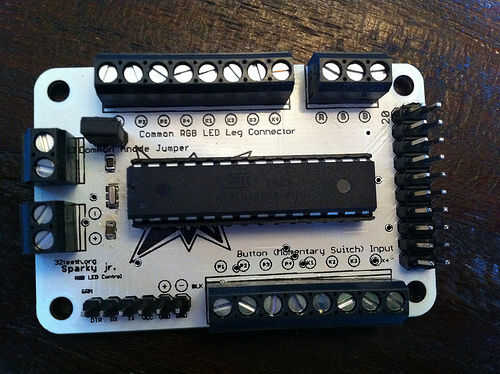 De forma predeterminada. El software Sparky se establece para actuar como si usted donde instalar LEDs de RGB cátodo común. Debe esto no adaptarse a su aplicación o consumo de energía y desea utilizar LEDs de ánodo común. Simplemente coloque el puente en la cabecera de 2 pin macho. El microcontrolador automáticamente detectará el puente y cambiar los pines de salida adecuada para una aplicación de ánodo común.