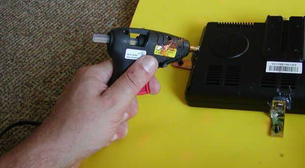 Coloque el monitor boca abajo sobre el plástico, alinear y rincón caliente-pegamento cuatro soportes a él. Asegúrese de orientar al monitor por lo que los conectores y conectores sobre el borde superior. También línea webcam y pegamento caliente a lo largo del borde superior del monitor así. Ahora puede confirmar la alineación de los agujeros de montaje y cámara web. Corte y haga estos agujeros y el monitor/webcam que con el hardware.