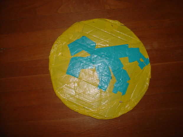 Después de haber cortado el cartón en un círculo, cubrir con cinta adhesiva para conductos, utilizamos amarillo para imitar el bronce.  Luego decorar con un color contrastante de cinta con un diseño de su elección, hemos utilizado un motivo de mantis religiosa.