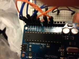 - Una vez se han tapado los agujeros en el arduino con los puentes, luego proceder a conectar los otros extremos a los agujeros correspondientes que se encuentran en la placa donde se unen las resistencias.