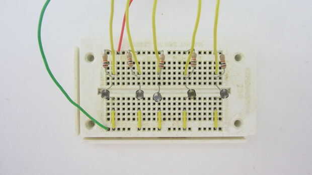 - A continuación, es establecer una conexión a tierra para que le enchufe una conexión de puente de la tierra de la arduino a la + lateral de la placa. En segundo lugar a lo largo de ese lado Conecte las resistencias en el mismo lado que el suelo de la tierra (o alimentación) a la mitad de la placa, que está más cerca del suelo (tren eléctrico). Luego hacemos otra conexión a la placa de arduino por puentes de conexión de la placa a los pines de arduino analogía 1-5.