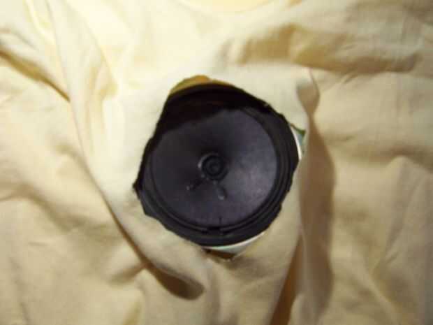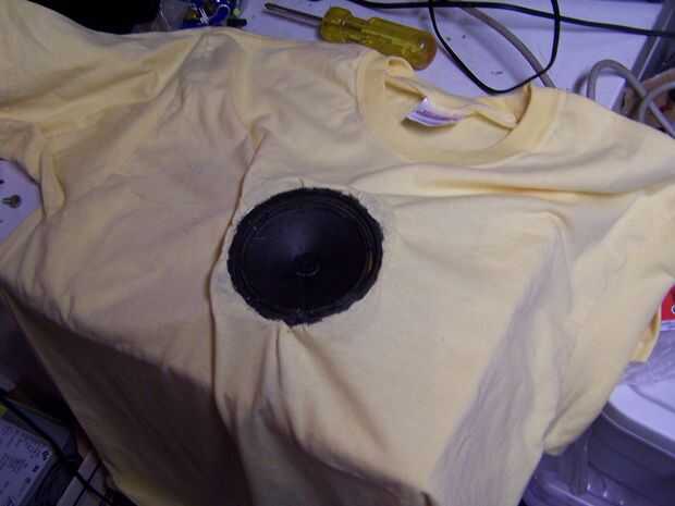Después de esto, poner el altavoz a través de la parte inferior de su camisa (para el cable de audio puede salir en la parte inferior) y una pistola de pegamento caliente. Hay un par de maneras que usted puede montar el altavoz, pero debido a las limitaciones de tiempo, me volví a mi fiel amigo Sr. Hot Glue. Utilizar para el contenido de su corazón. No se lastime. De la aleta.
